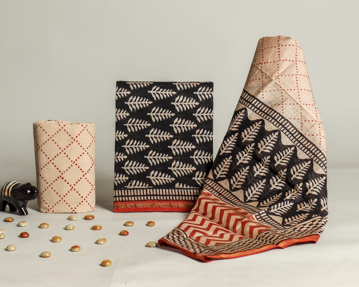 Hand Block Printed Chanderi Silk suit Chanderi Top -2.5 mtr Cotton Bottom 2.5 Mrs Chanderi Dupatta – 2.5 mtr