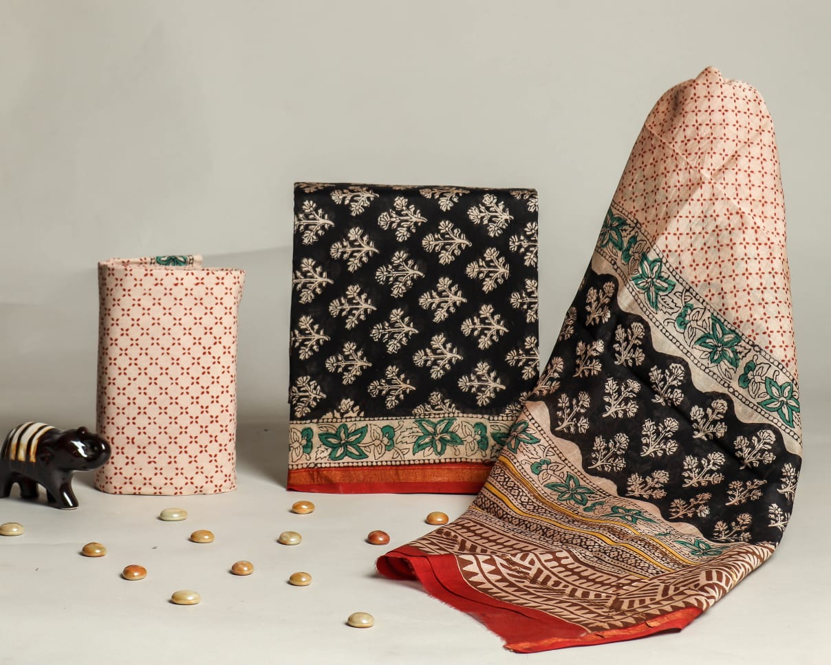 Hand Block Printed Chanderi Silk suit Chanderi Top -2.5 mtr Cotton Bottom 2.5 Mrs Chanderi Dupatta – 2.5 mtr
