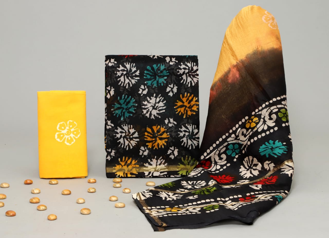 Hand Block Printed Chanderi Silk suit Chanderi Top -2.5 mtr Cotton Bottom 2.5 Mrs Chanderi Dupatta – 2.5 mtr