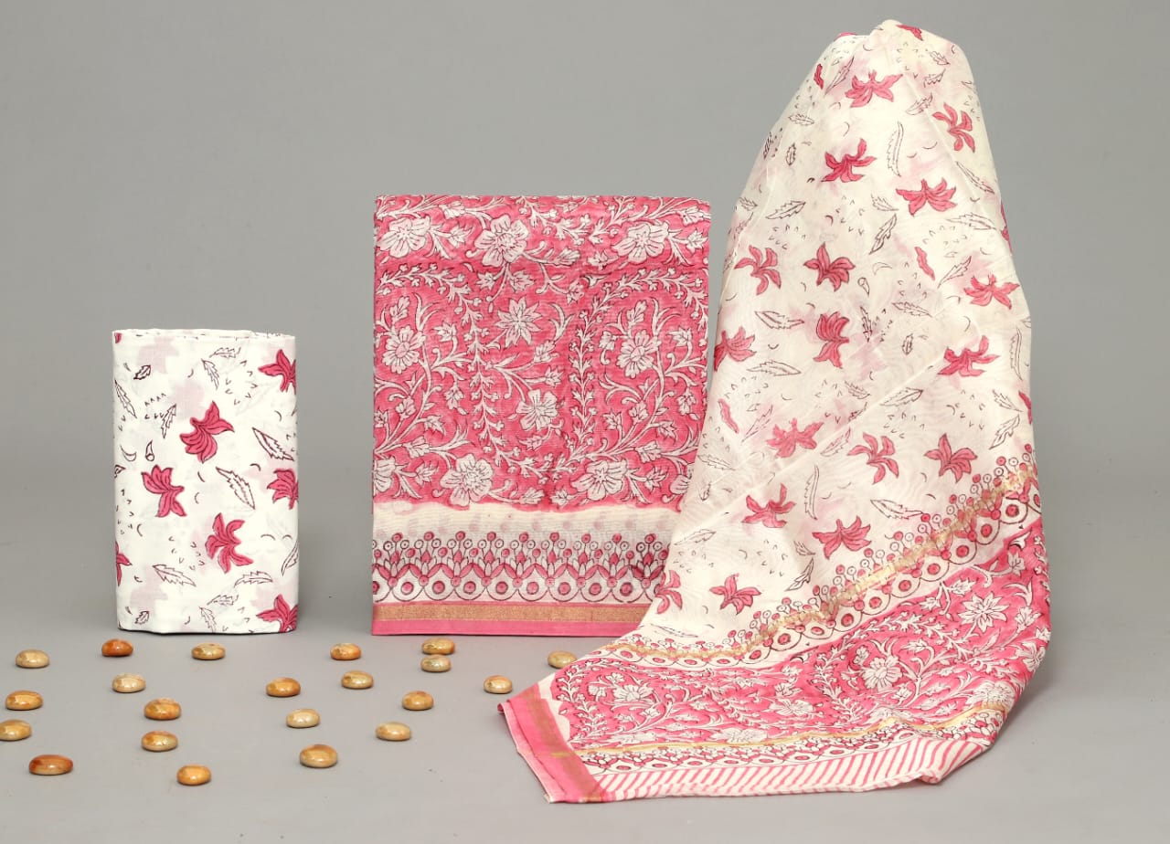 Hand Block Printed Chanderi Silk suit Chanderi Top -2.5 mtr Cotton Bottom 2.5 Mrs Chanderi Dupatta – 2.5 mtr