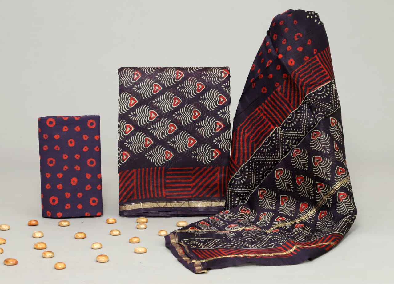 Hand Block Printed Chanderi Silk suit Chanderi Top -2.5 mtr Cotton Bottom 2.5 Mrs Chanderi Dupatta – 2.5 mtr