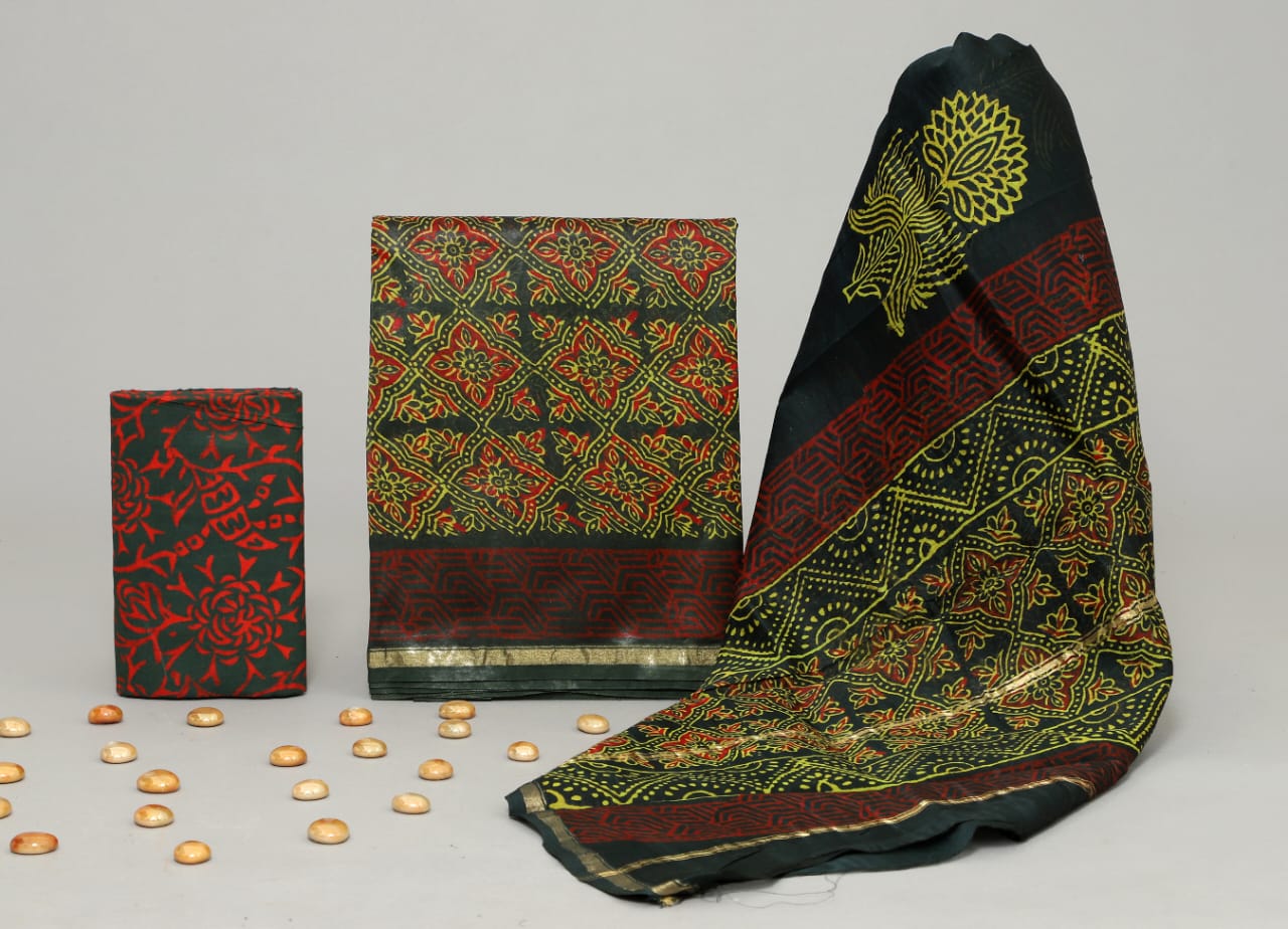 Hand Block Printed Chanderi Silk suit Chanderi Top -2.5 mtr Cotton Bottom 2.5 Mrs Chanderi Dupatta – 2.5 mtr