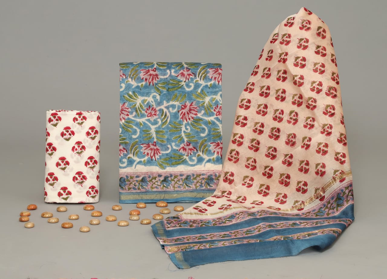 Hand Block Printed Chanderi Silk suit Chanderi Top -2.5 mtr Cotton Bottom 2.5 Mrs Chanderi Dupatta – 2.5 mtr