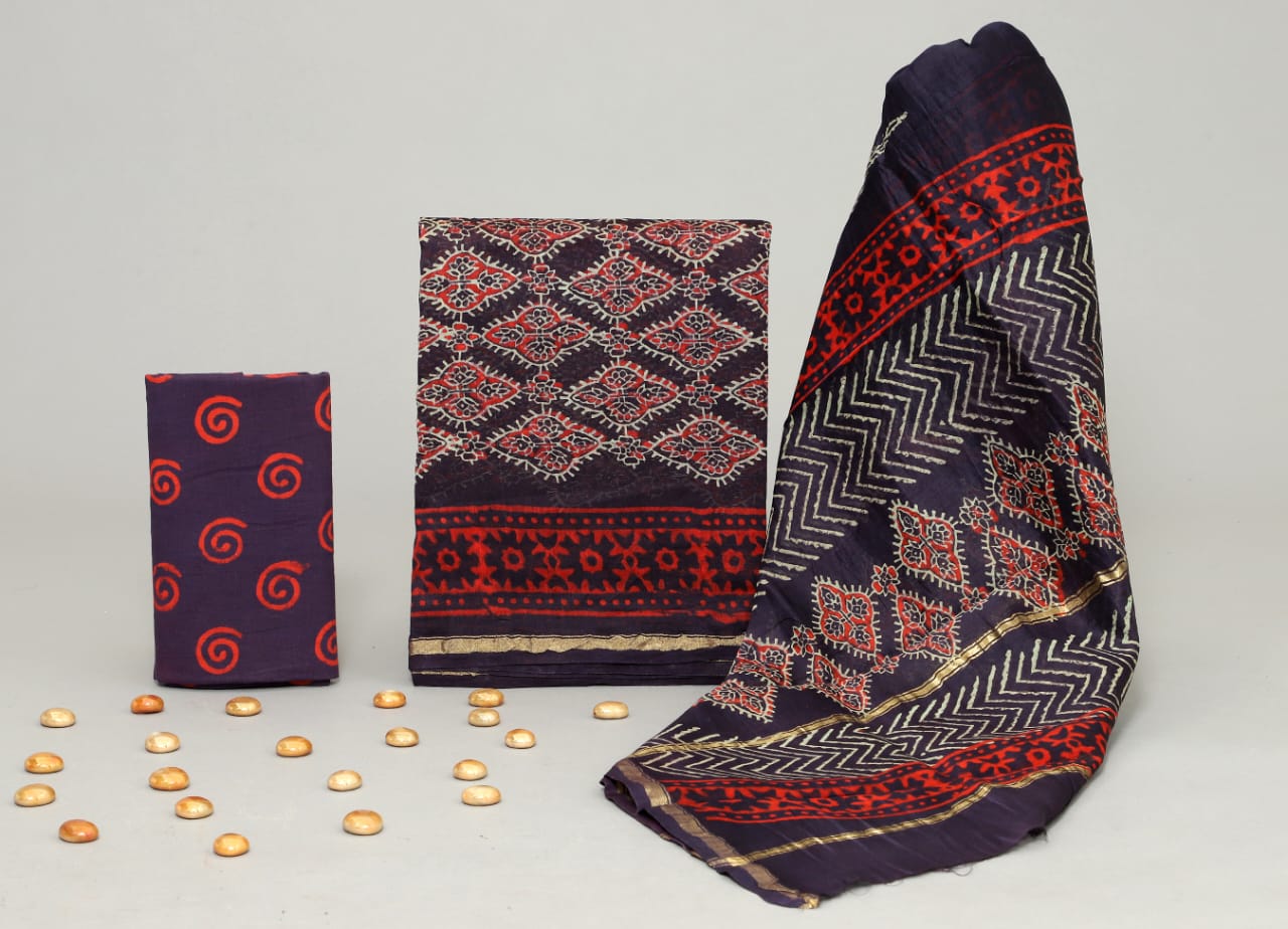Hand Block Printed Chanderi Silk suit Chanderi Top -2.5 mtr Cotton Bottom 2.5 Mrs Chanderi Dupatta – 2.5 mtr