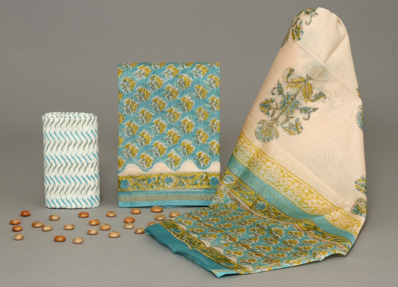 Hand Block Printed Chanderi Silk suit Chanderi Top -2.5 mtr Cotton Bottom 2.5 Mrs Chanderi Dupatta – 2.5 mtr