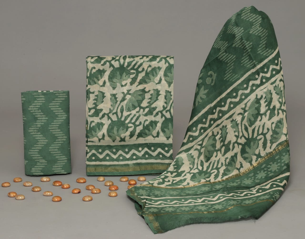 Hand Block Printed Chanderi Silk suit Chanderi Top -2.5 mtr Cotton Bottom 2.5 Mrs Chanderi Dupatta – 2.5 mtr