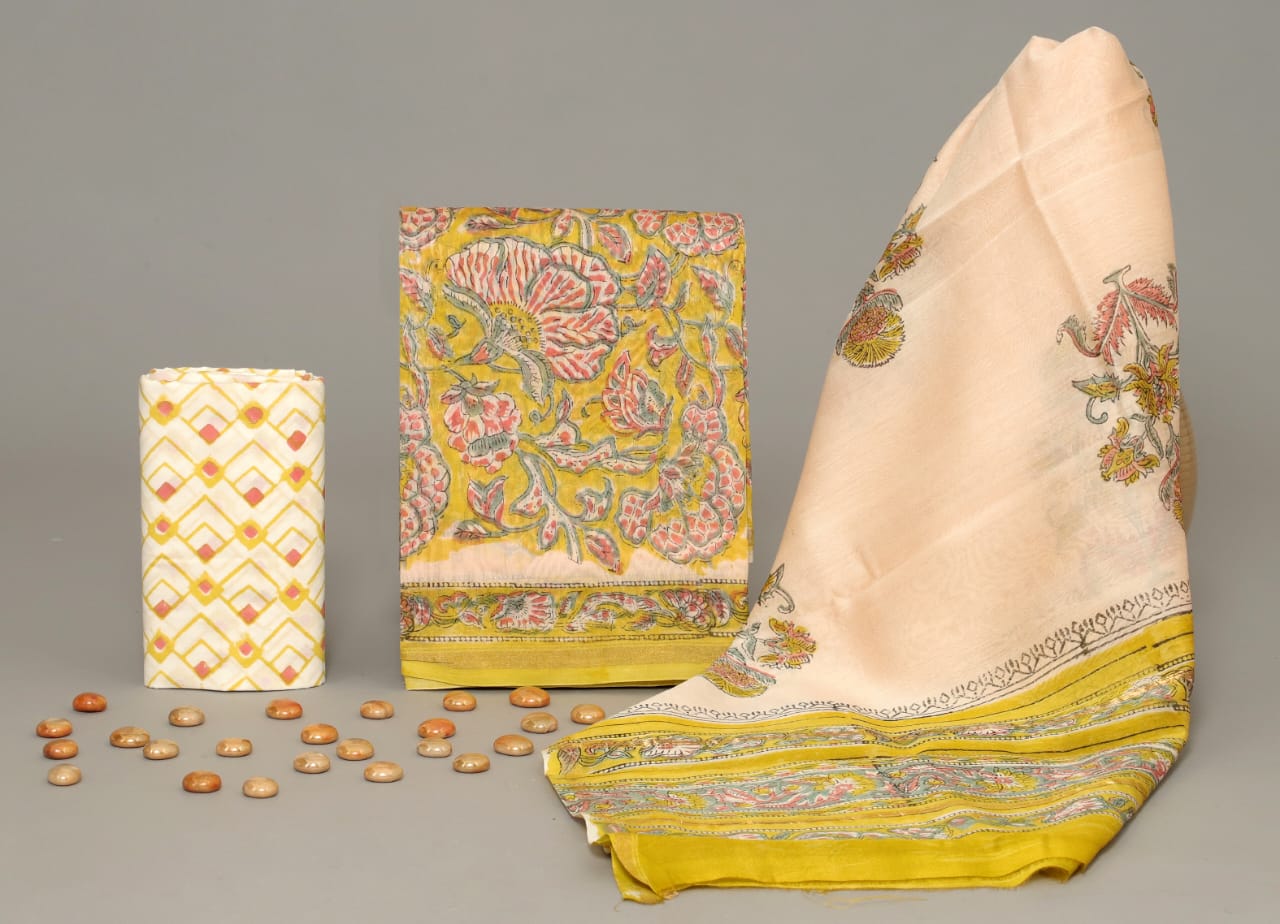 Hand Block Printed Chanderi Silk suit Chanderi Top -2.5 mtr Cotton Bottom 2.5 Mrs Chanderi Dupatta – 2.5 mtr