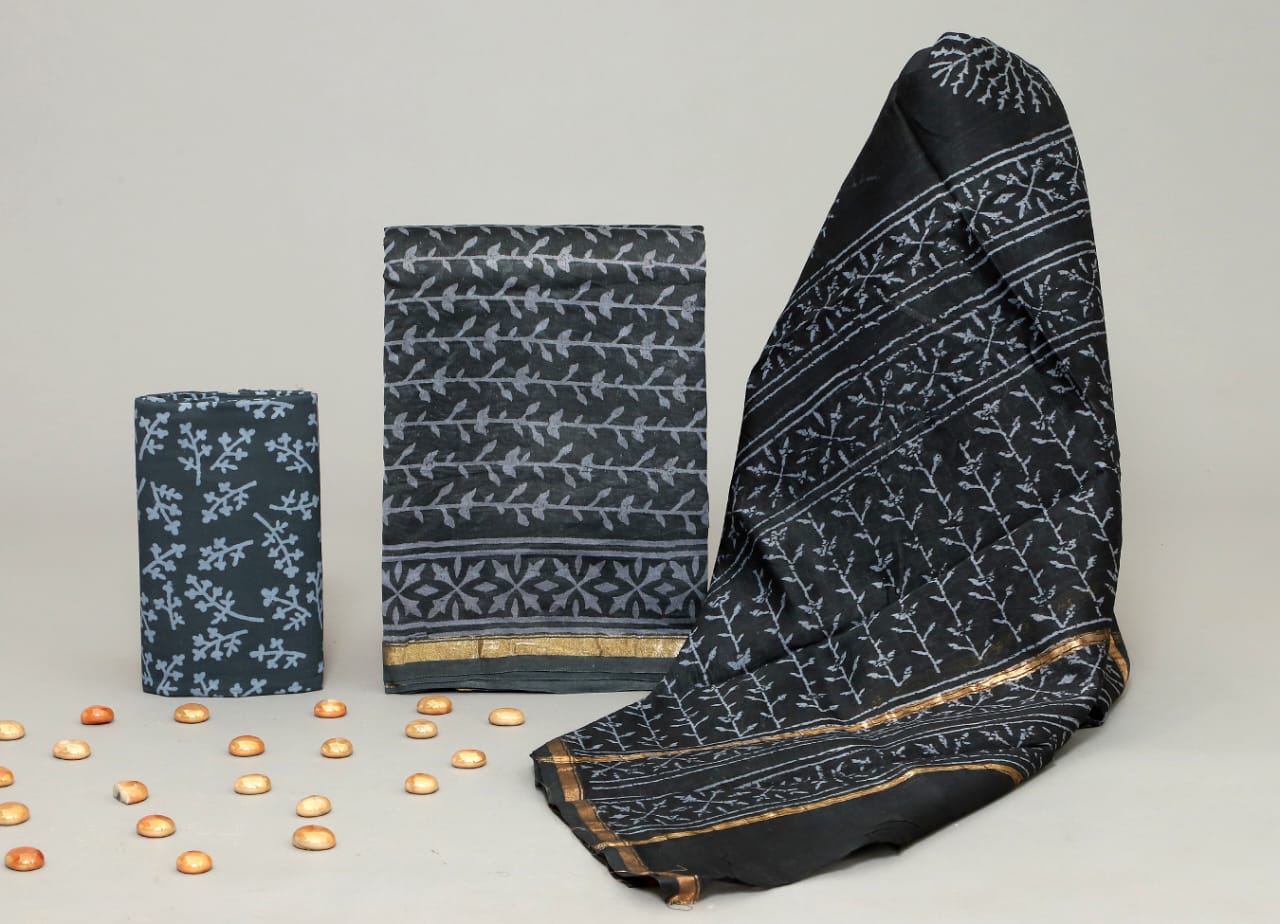 Hand Block Printed Chanderi Silk suit Chanderi Top -2.5 mtr Cotton Bottom 2.5 Mrs Chanderi Dupatta – 2.5 mtr