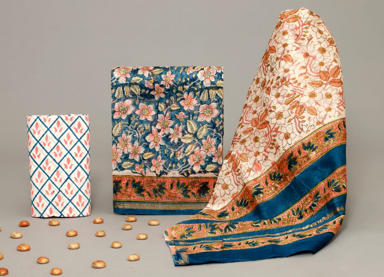 Hand Block Printed Chanderi Silk suit Chanderi Top -2.5 mtr Cotton Bottom 2.5 Mrs Chanderi Dupatta – 2.5 mtr