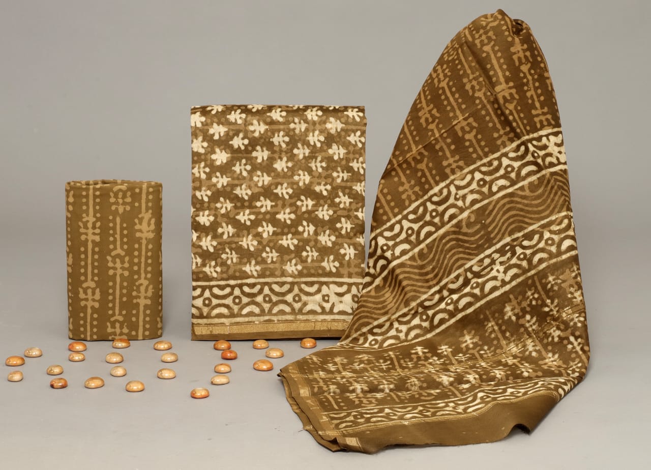 Hand Block Printed Chanderi Silk suit Chanderi Top -2.5 mtr Cotton Bottom 2.5 Mrs Chanderi Dupatta – 2.5 mtr