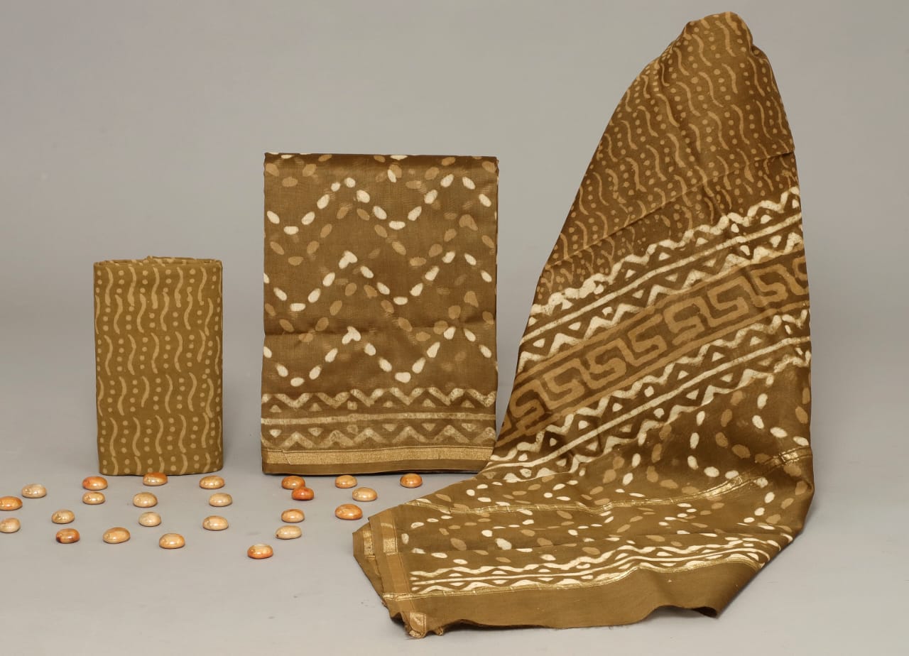 Hand Block Printed Chanderi Silk suit Chanderi Top -2.5 mtr Cotton Bottom 2.5 Mrs Chanderi Dupatta – 2.5 mtr