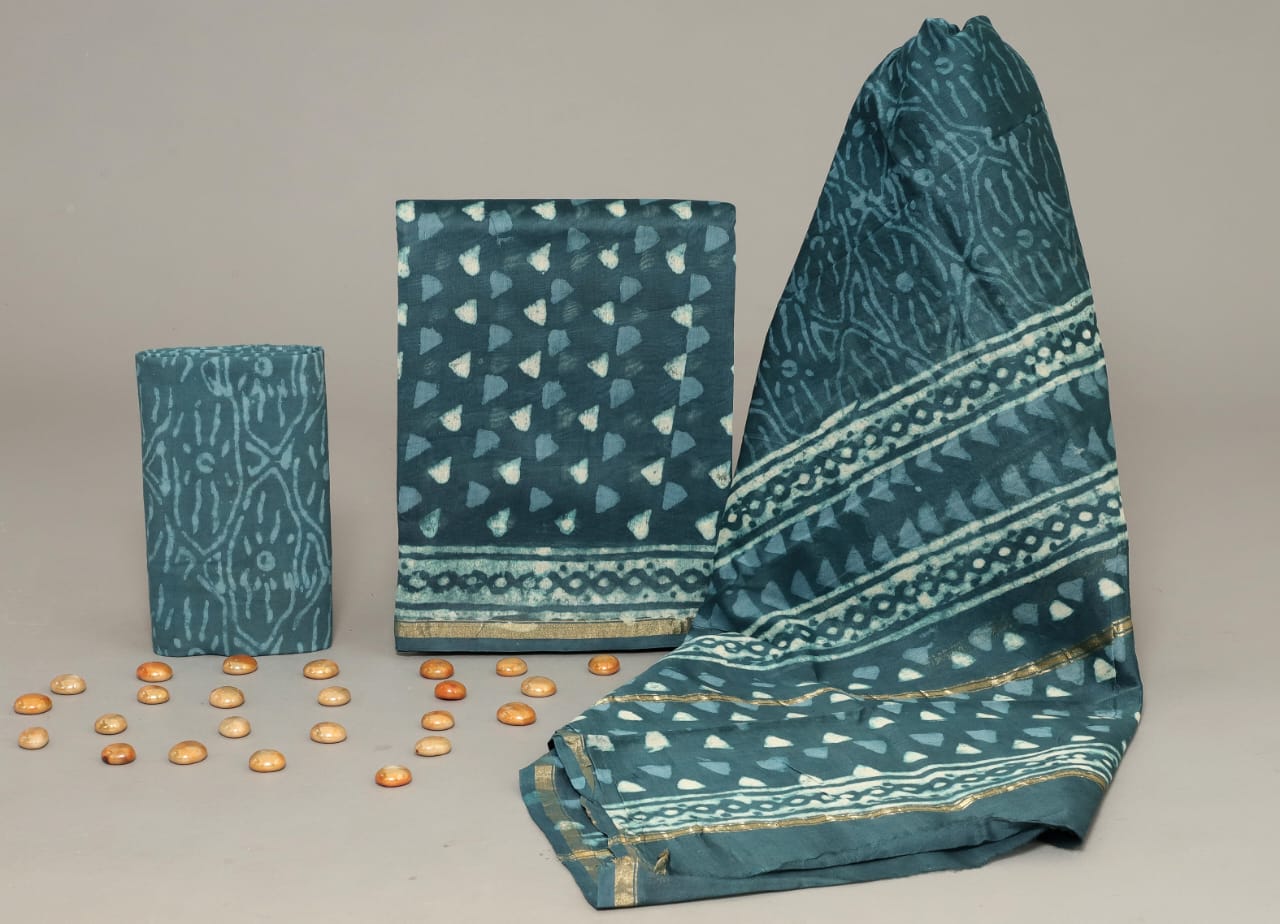 Hand Block Printed Chanderi Silk suit Chanderi Top -2.5 mtr Cotton Bottom 2.5 Mrs Chanderi Dupatta – 2.5 mtr
