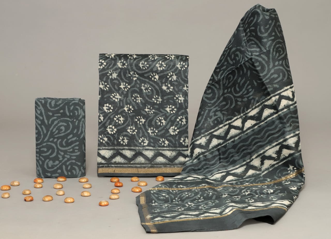 Hand Block Printed Chanderi Silk suit Chanderi Top -2.5 mtr Cotton Bottom 2.5 Mrs Chanderi Dupatta – 2.5 mtr