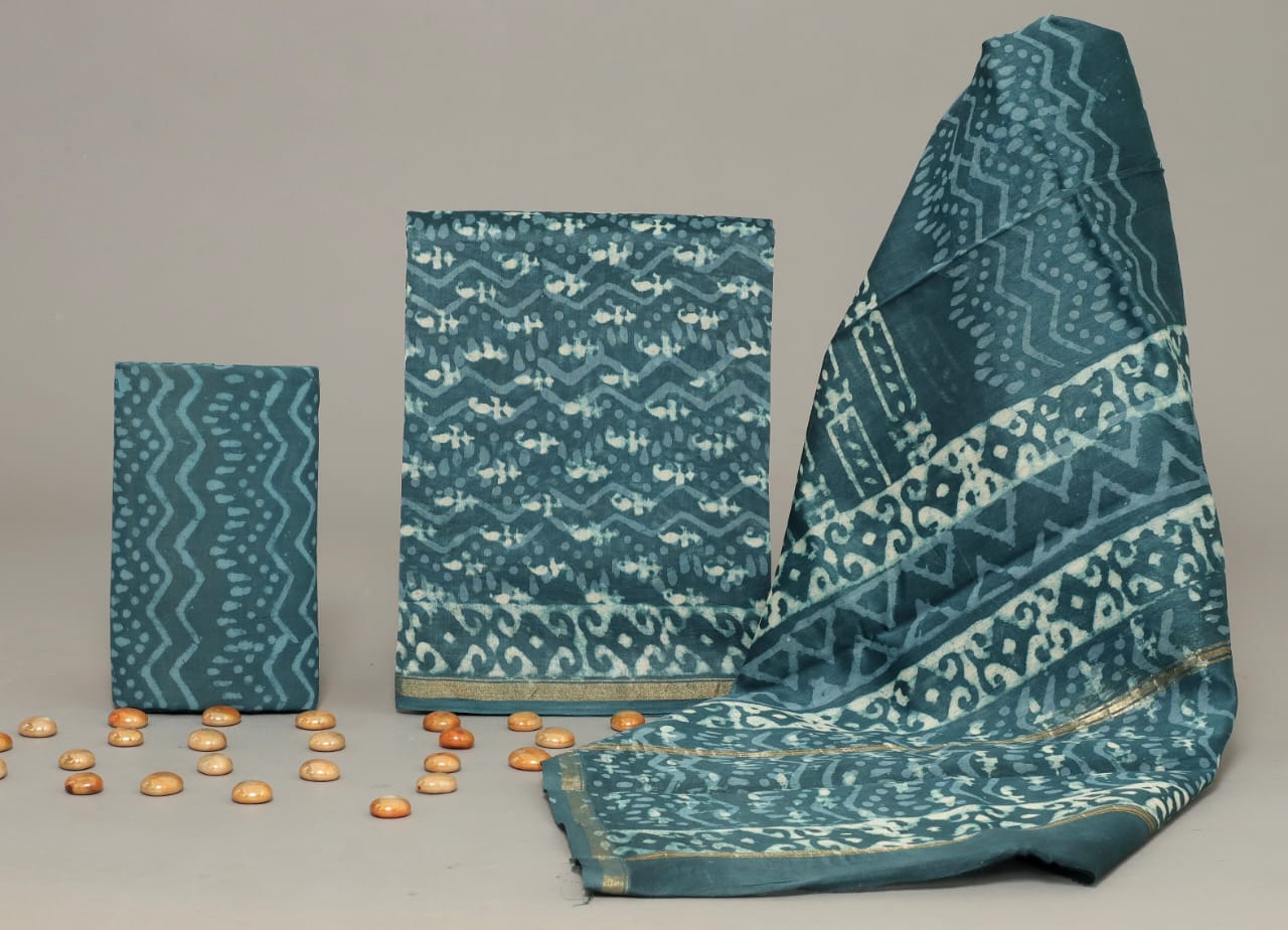 Hand Block Printed Chanderi Silk suit Chanderi Top -2.5 mtr Cotton Bottom 2.5 Mrs Chanderi Dupatta – 2.5 mtr