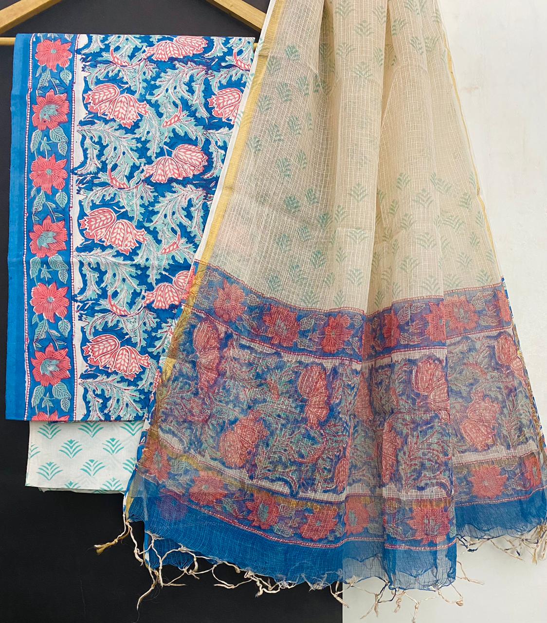 handblock printed pure cotton suits with kota doriya dupatta