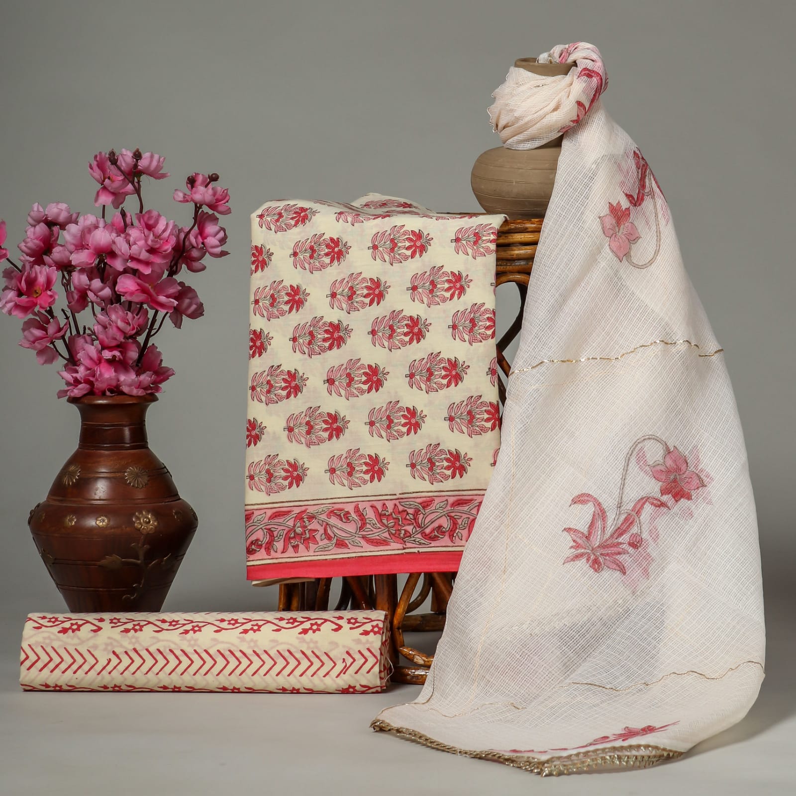 Kota Doria Dupatta Suit Materials in fine Hand Block Print