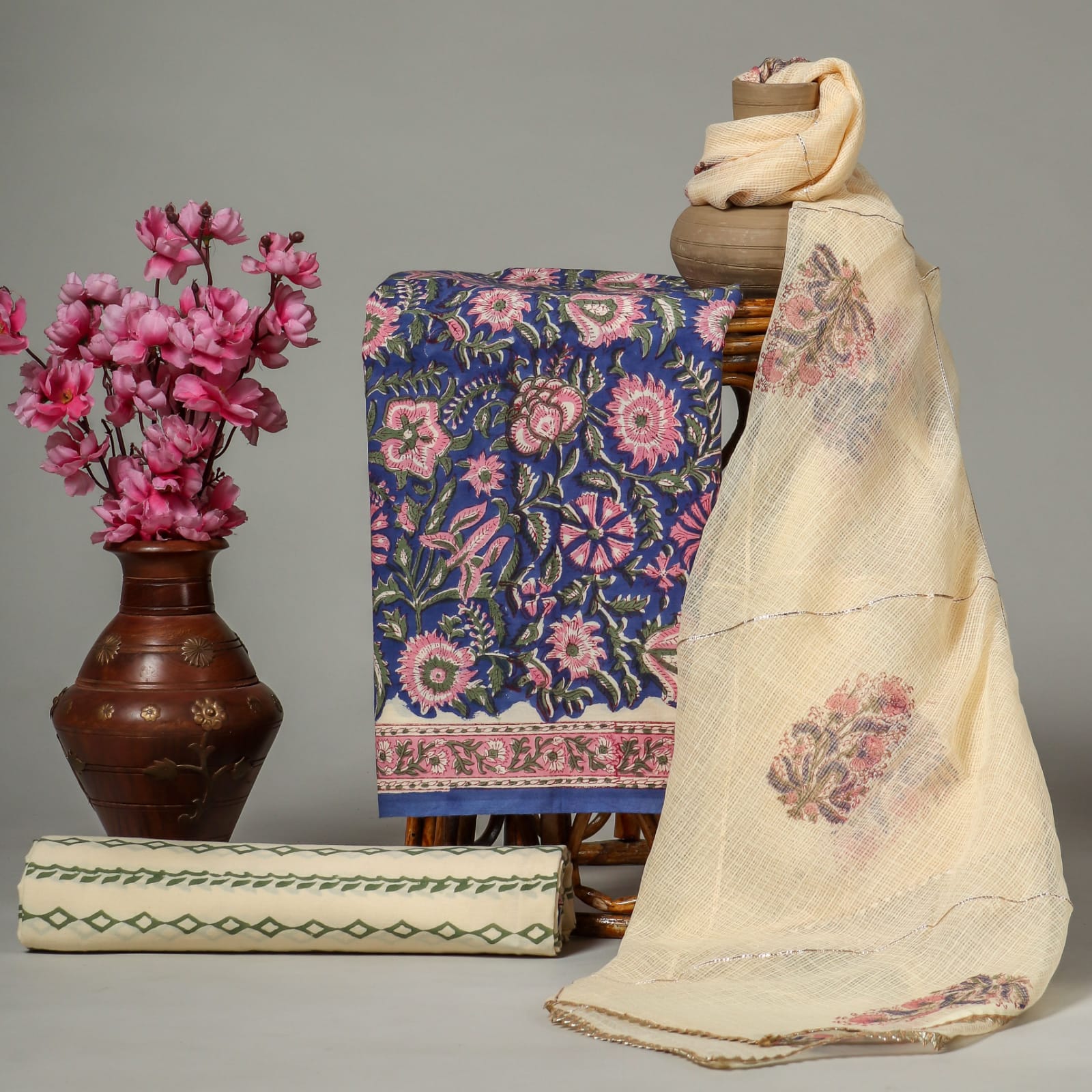 Kota Doria Dupatta Suit Materials in fine Hand Block Print