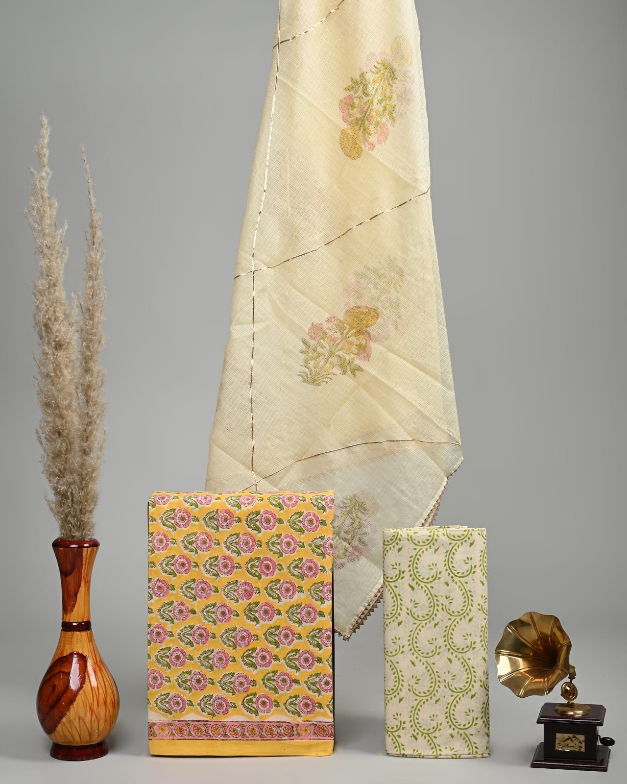 Kota Doria Dupatta Suit Materials in fine Hand Block Print