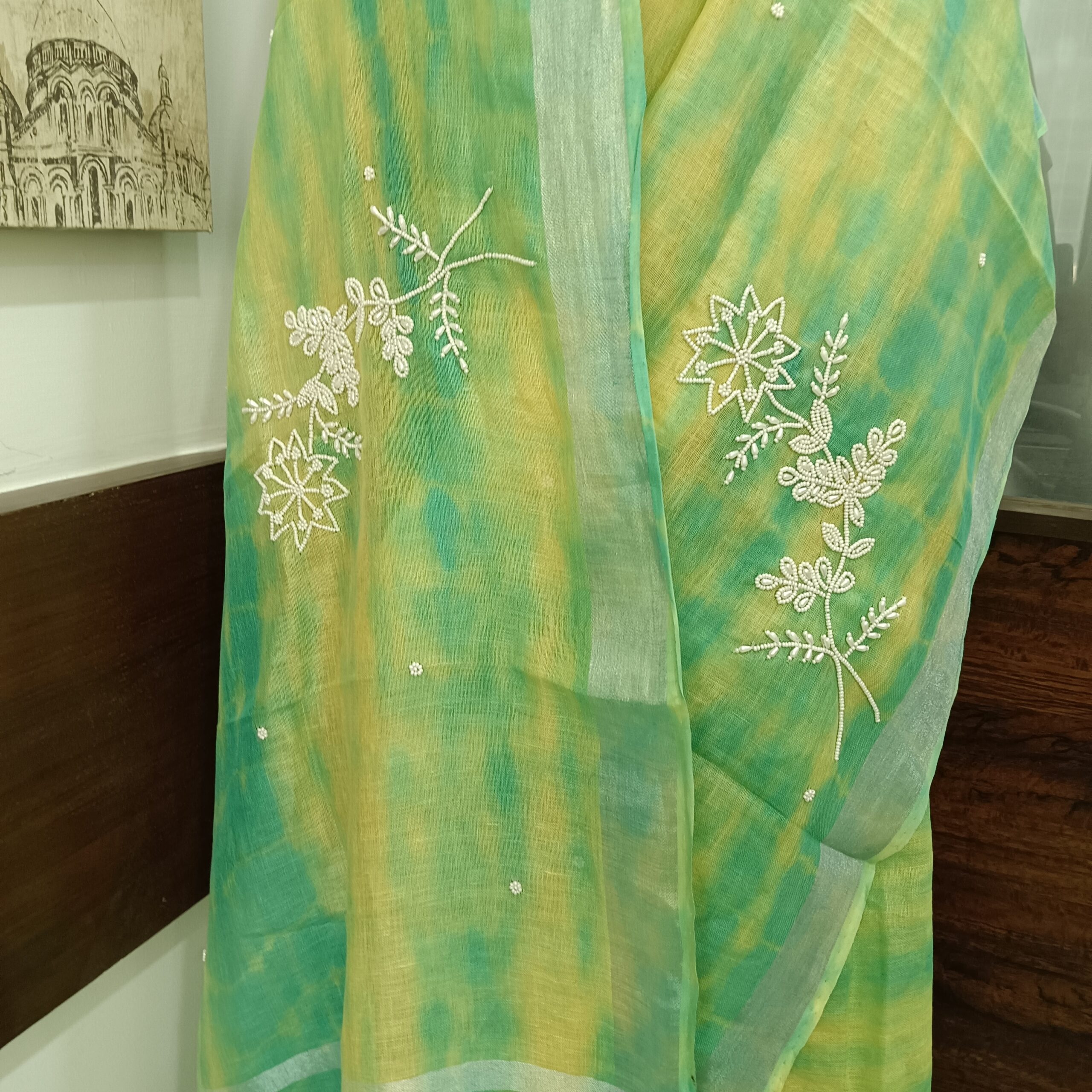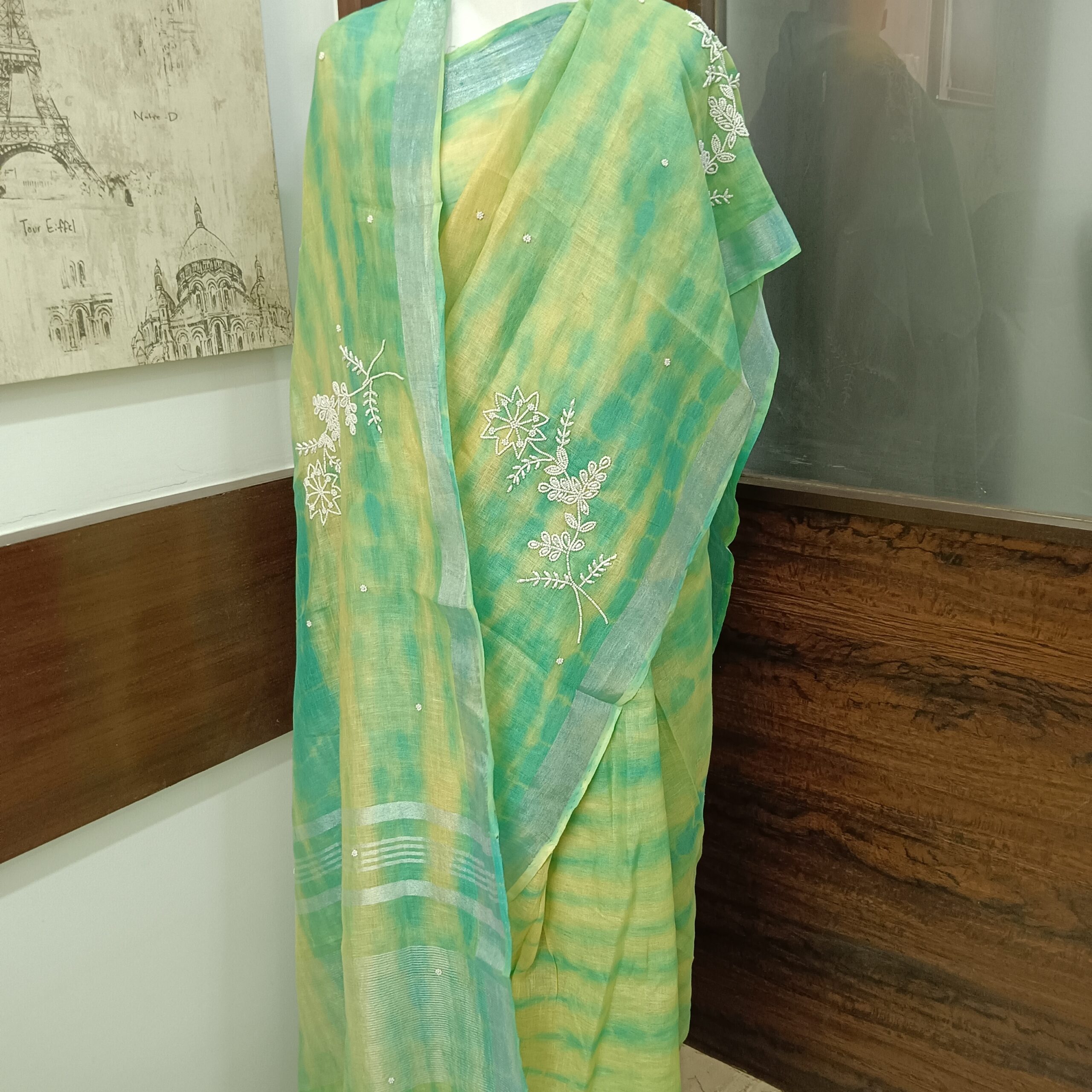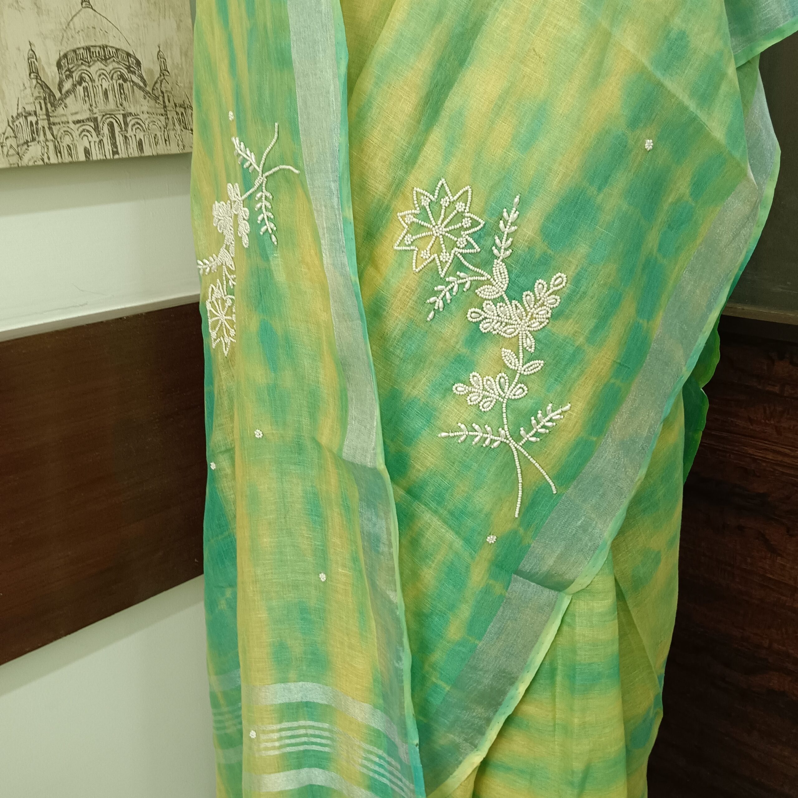 A Beautiful Linen Shibori saree with handcrafted pearl work.