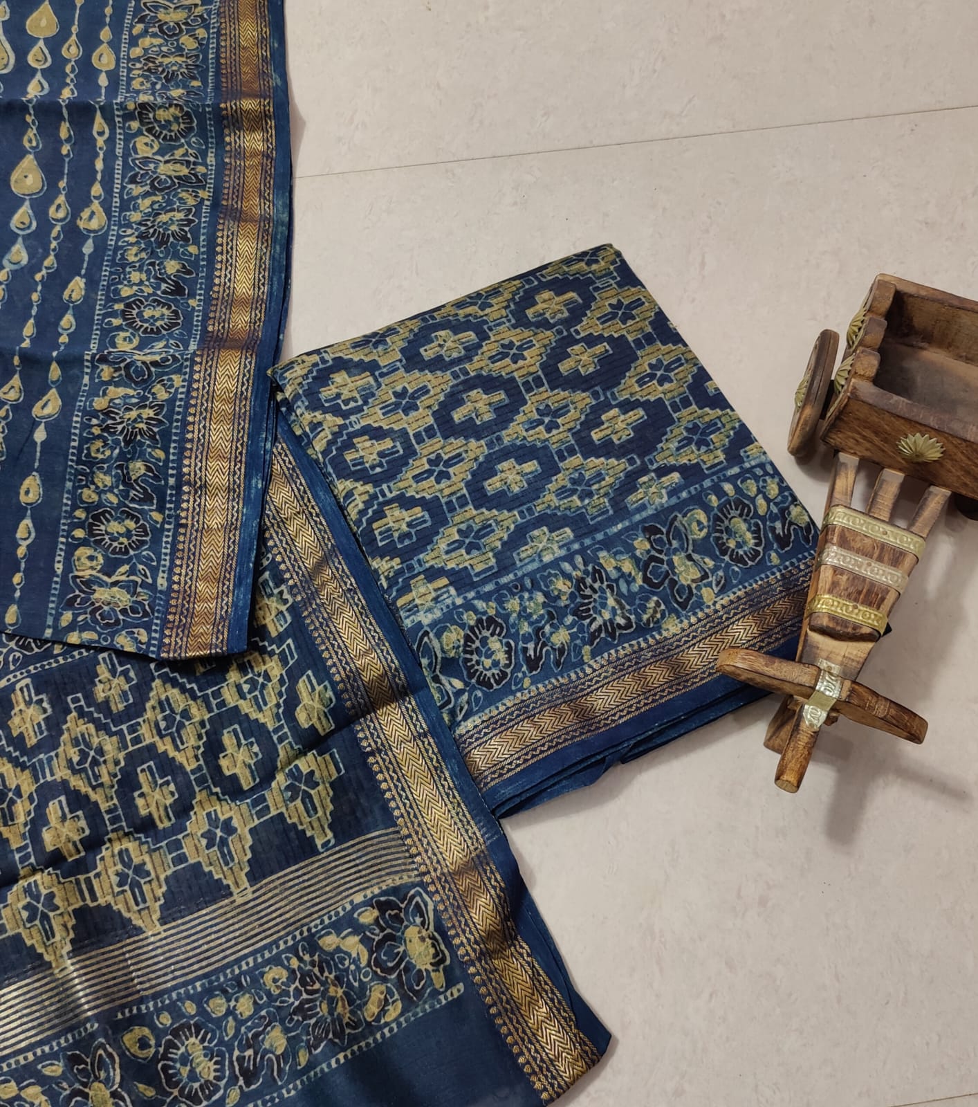 Maheshwari silk suits with hand stitched shibori work and Ajrak print