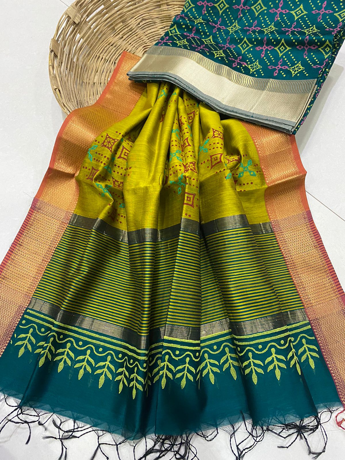 Silver Golden Zari Parrot Butas Silk Saree With Silk Mark label