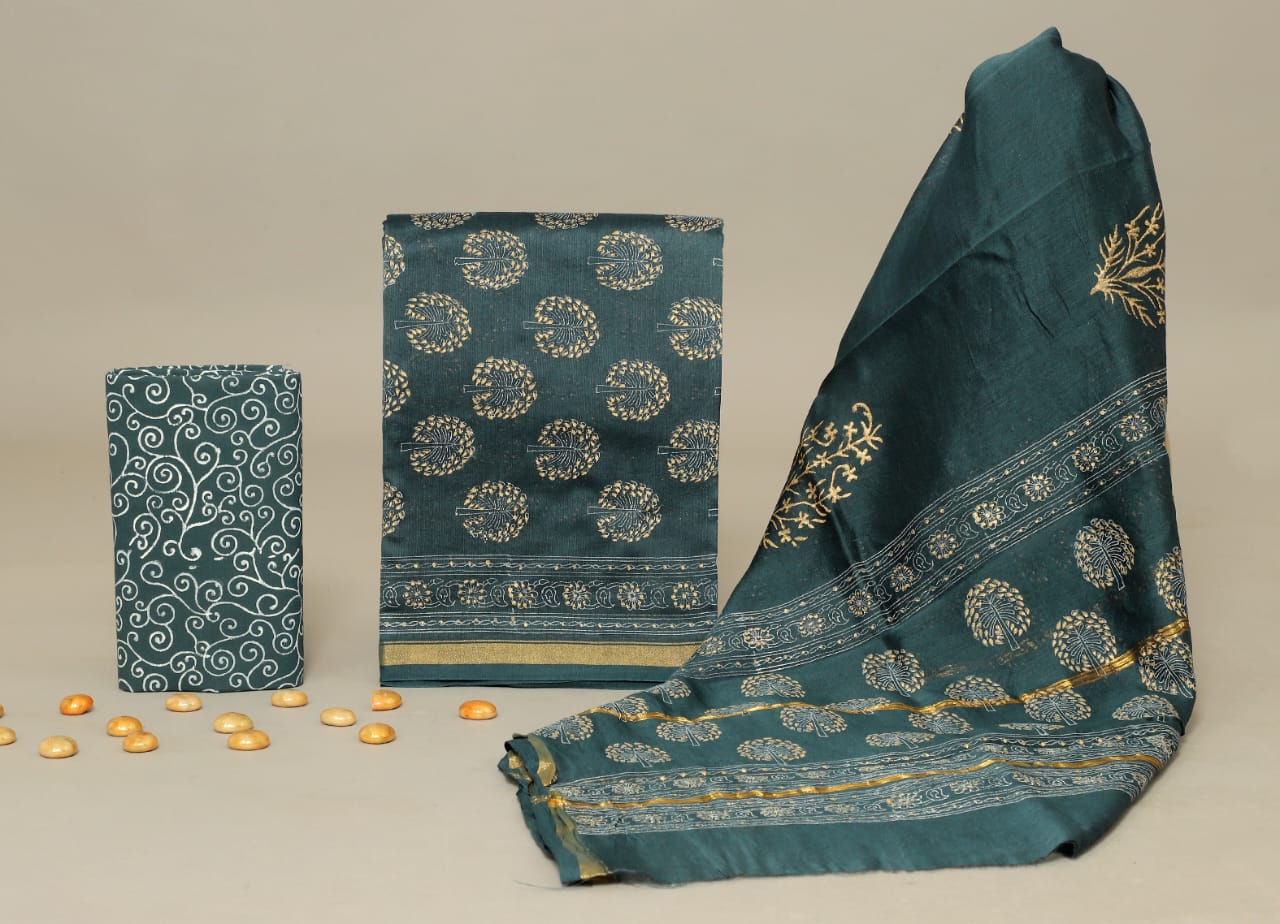 New exclusive hand Designer block printed pure chanderi suit sets with cotton bottom