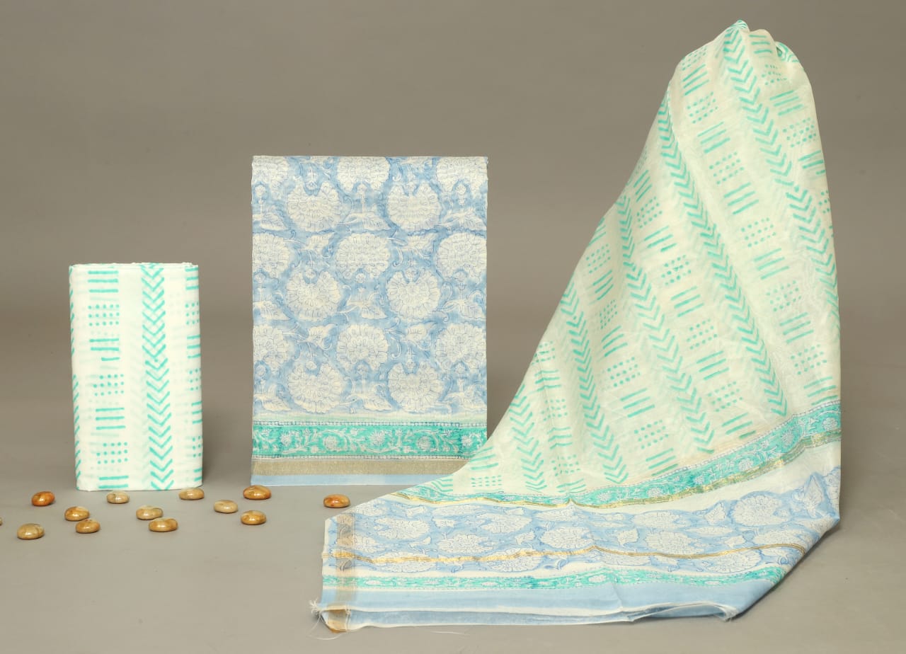 New exclusive hand Designer block printed pure chanderi suit sets with cotton bottom