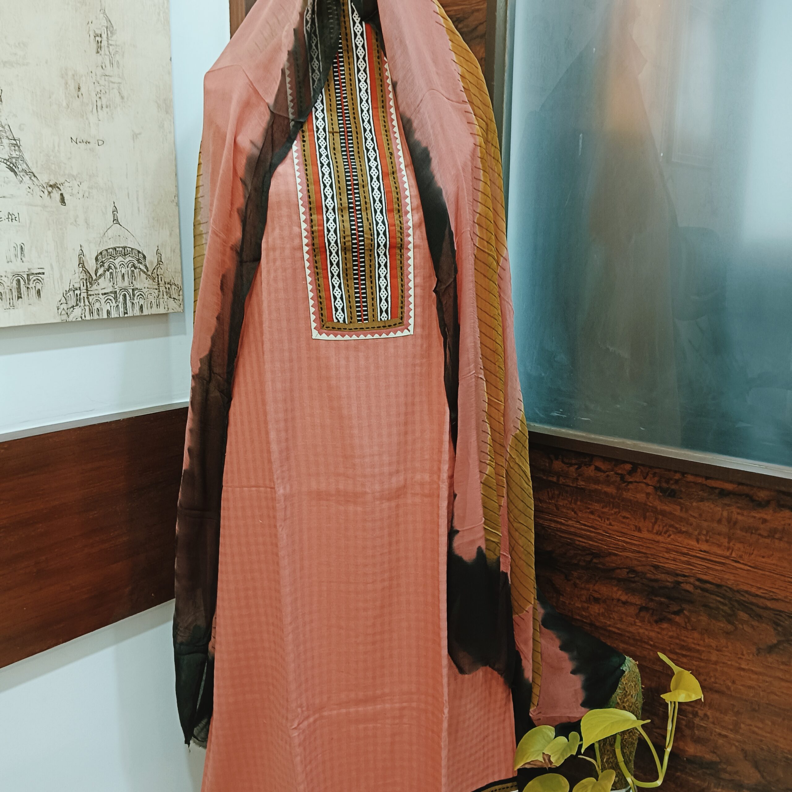 A beautiful pure cotton suits with a patch neck in exclusive kantha stitch accompanied with a pure chiffon dupatta