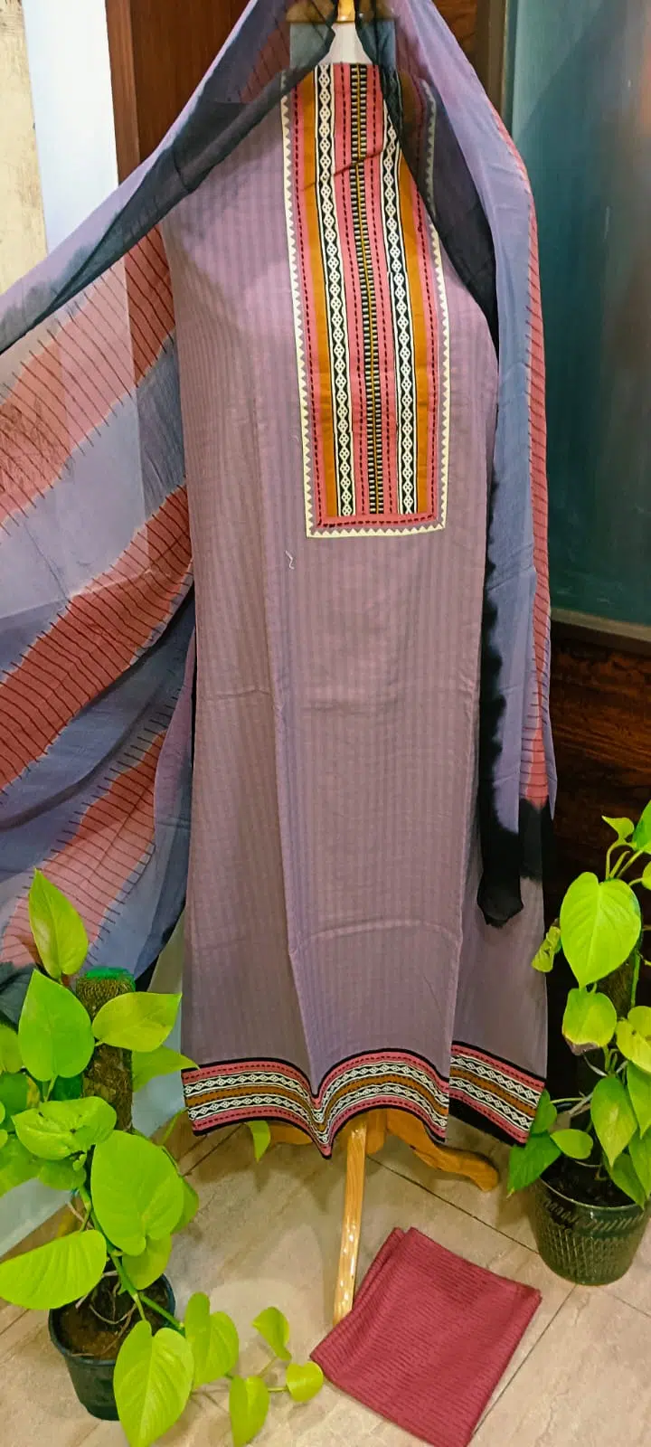 A beautiful pure cotton suits with a patch neck in exclusive kantha stitch accompanied with a pure chiffon dupatta