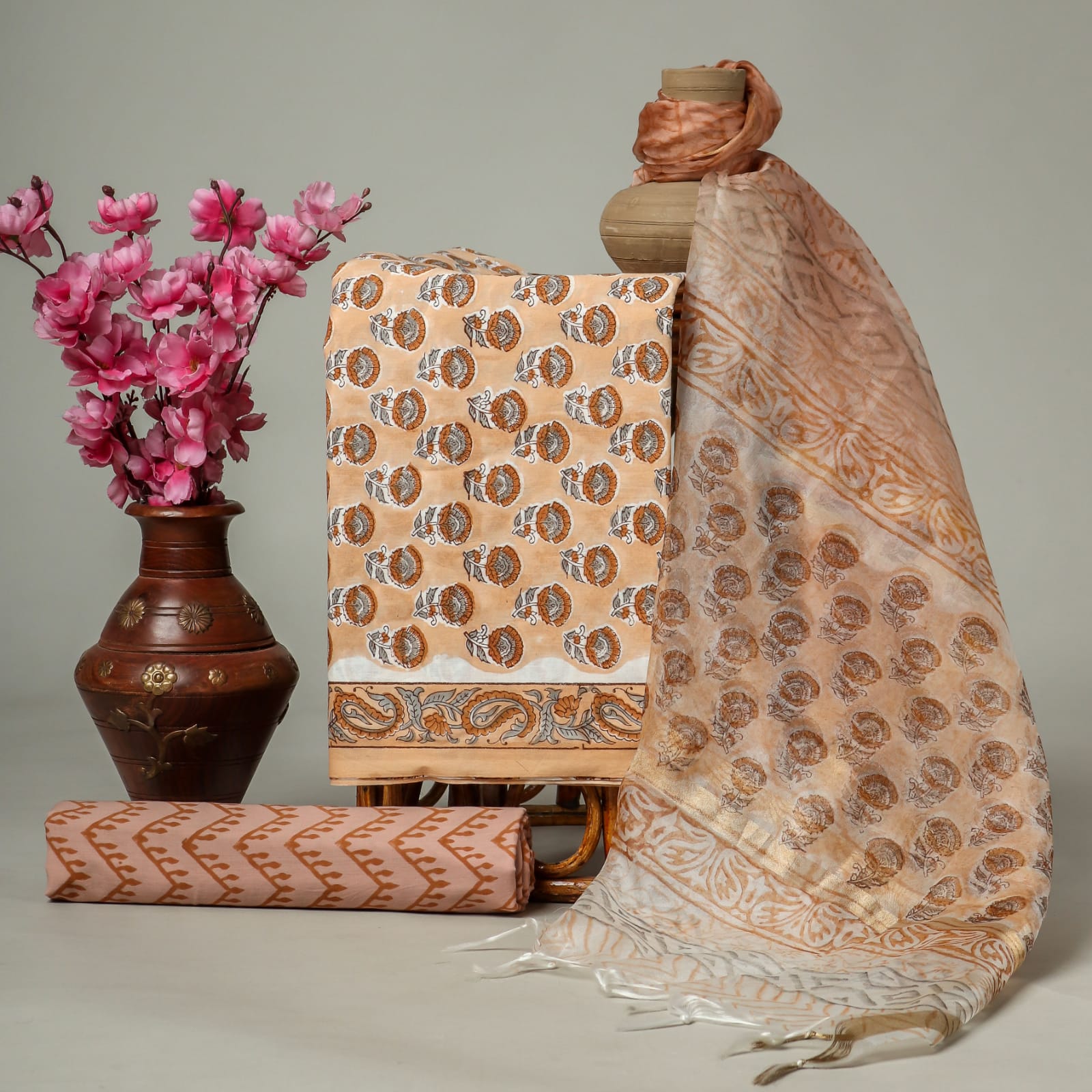 HomePURE COTTON WITH ORGANZA DUPATTA Pure cotton hand block printed suits with organza dupatta