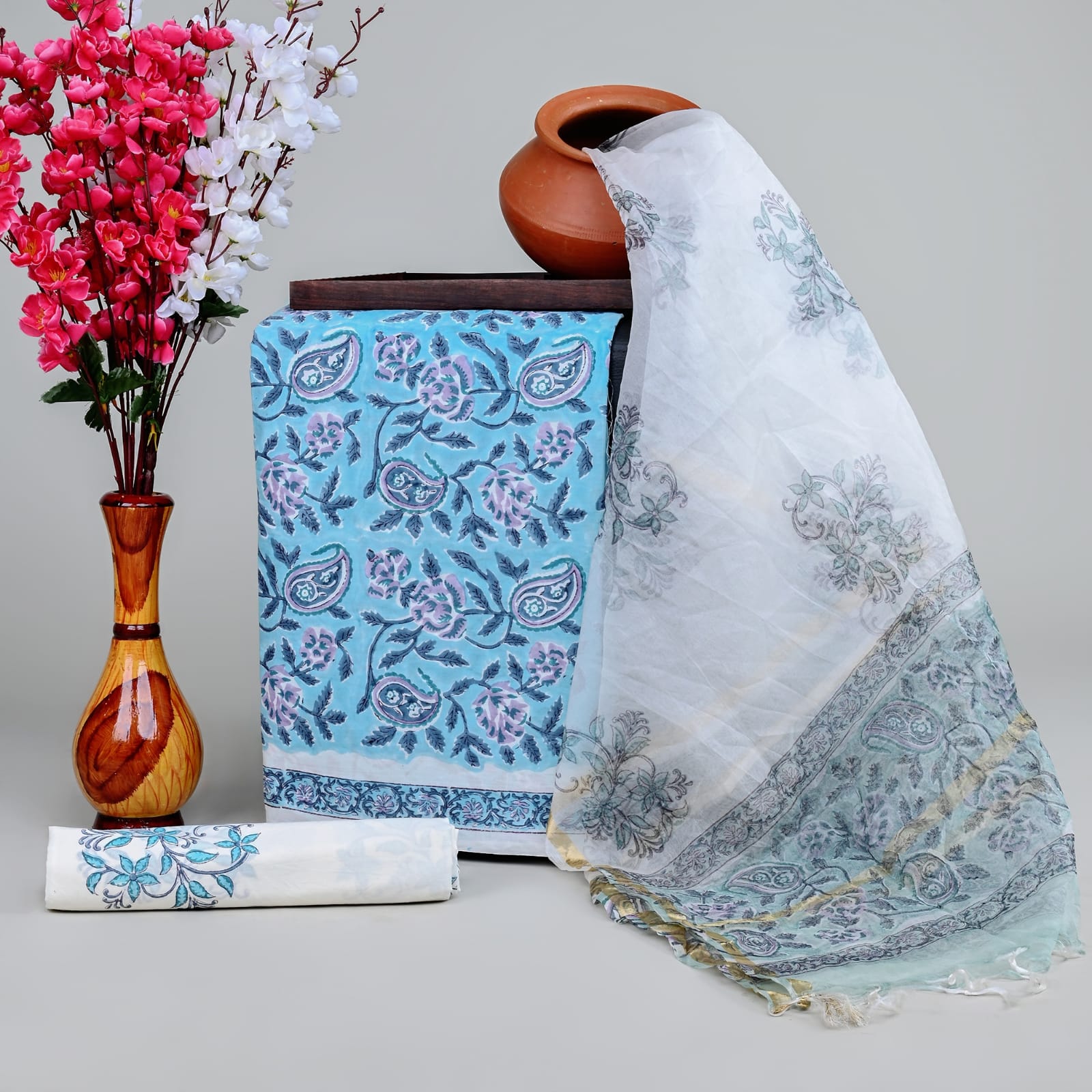 Pure cotton hand block printed suits with organza dupatta
