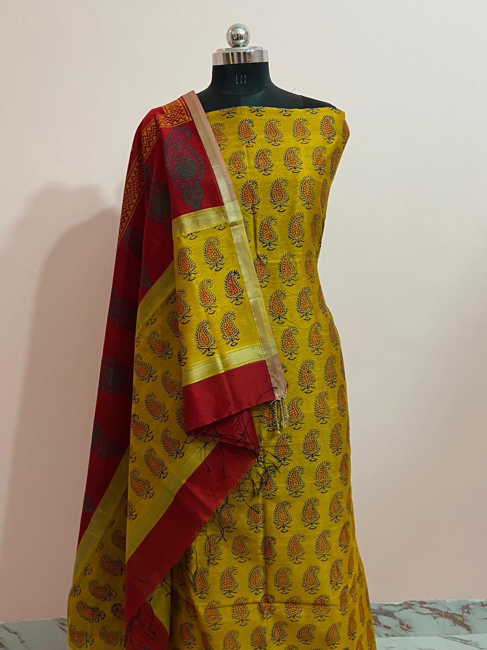 HomeHand Block Dress Material In SICO Pure Handloom Block print dress Material With golden zari work