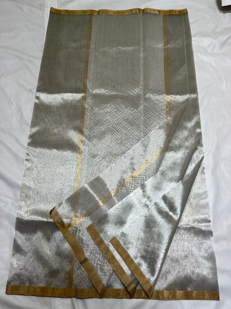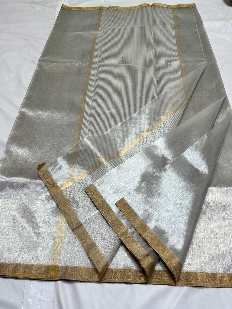 Zari plane tissue silk saree With silver golden zari beautiful stripe pallu & golden Zari solid boder
