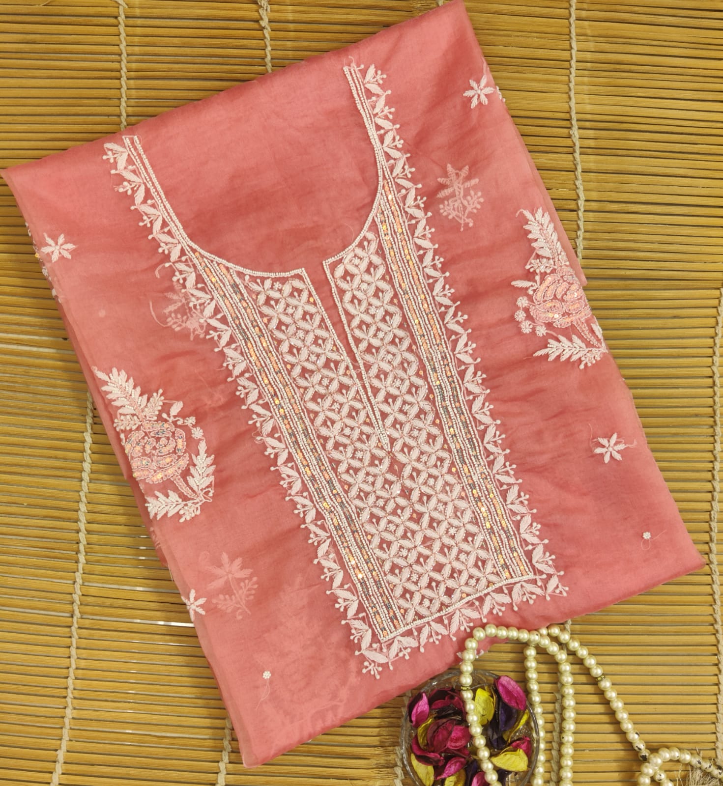 Pure ORGANZA Shirt and Dupatta very beautiful colors having very Intricate Chikankari Handwork embroidery embellished with Beautiful Pearl work done with 2.5 meter Pure ORGANZA Silk Dupatta.