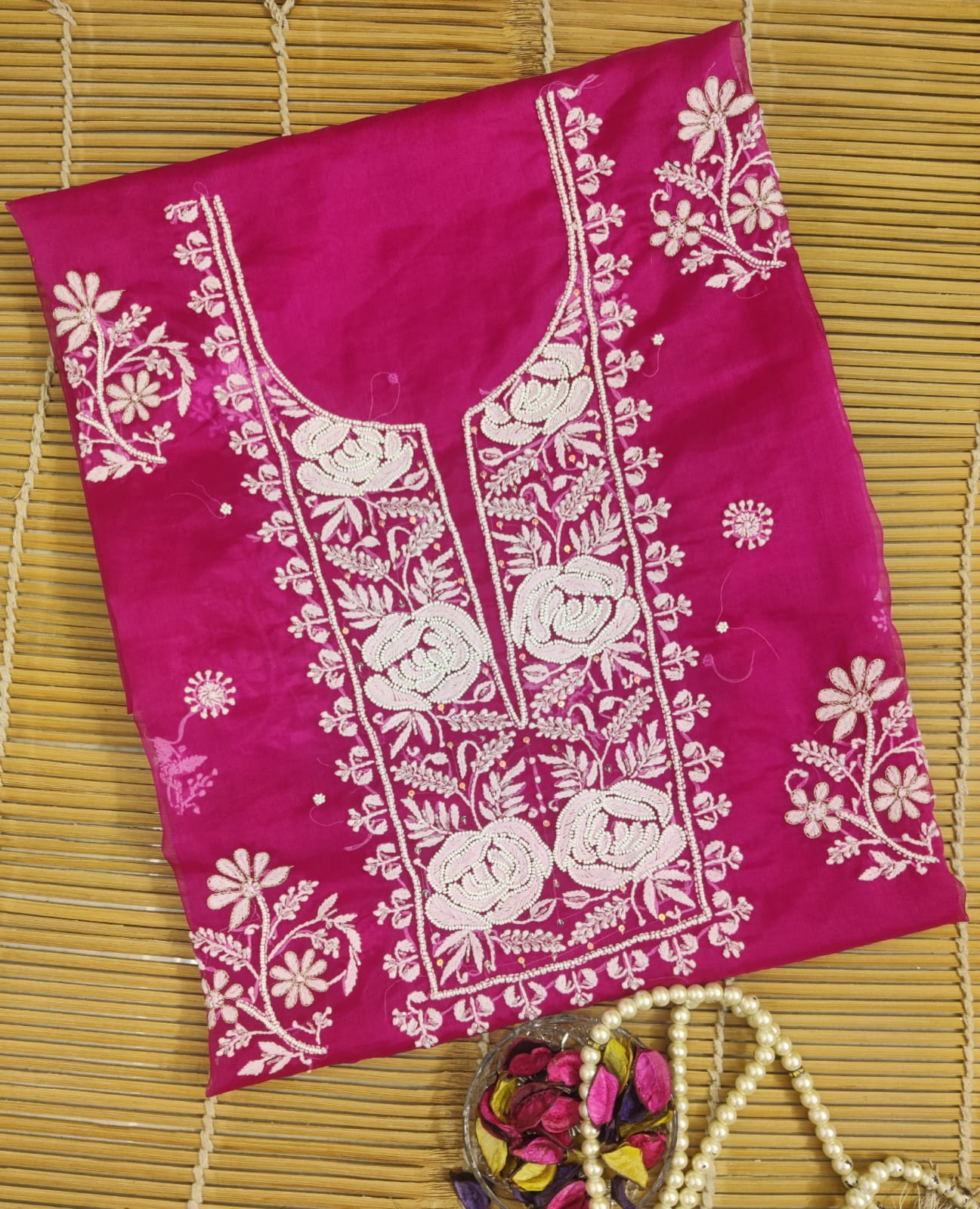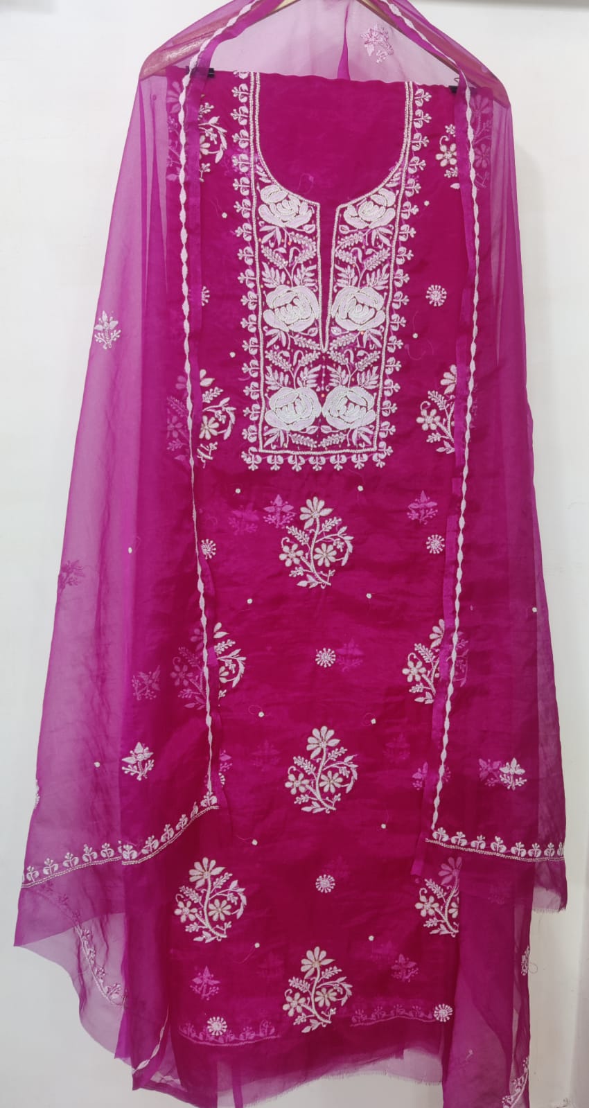 Pure ORGANZA Shirt and Dupatta very beautiful colors having very Intricate Chikankari Handwork embroidery embellished with Beautiful Pearl work done with 2.5 meter Pure ORGANZA Silk Dupatta.