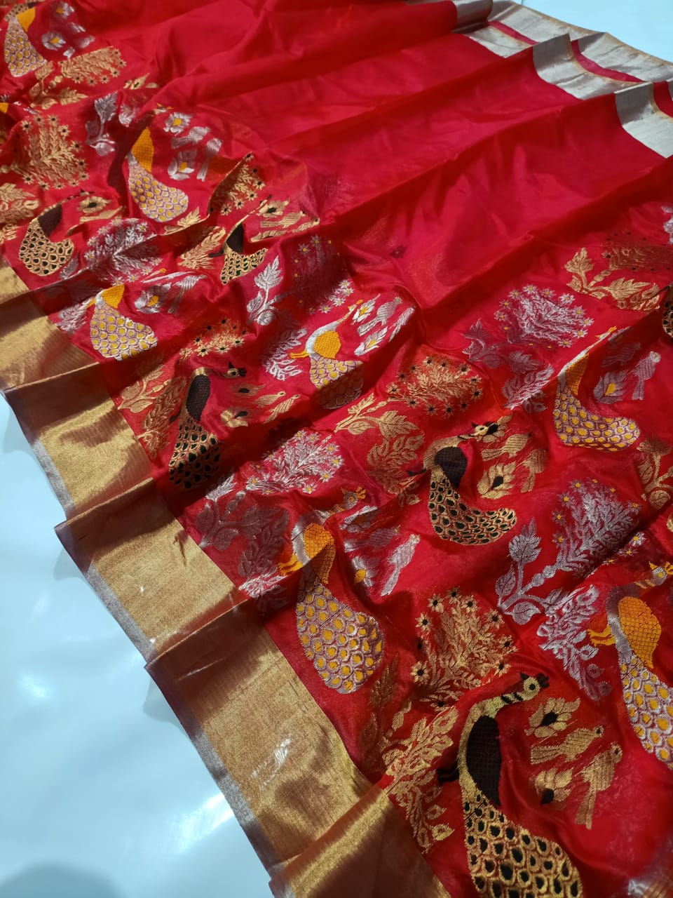 HomeChanderi Silk Sarees Pure silk Vrindavan Minakari Handwork Saree
