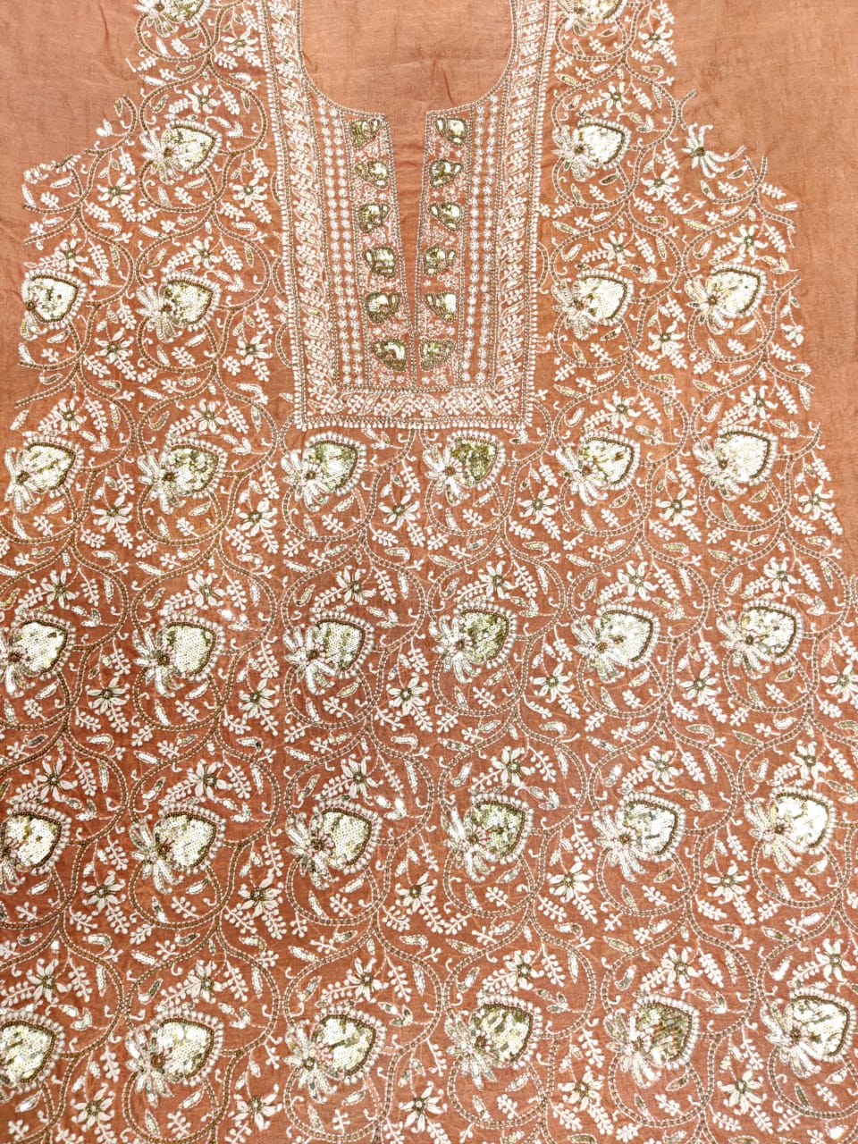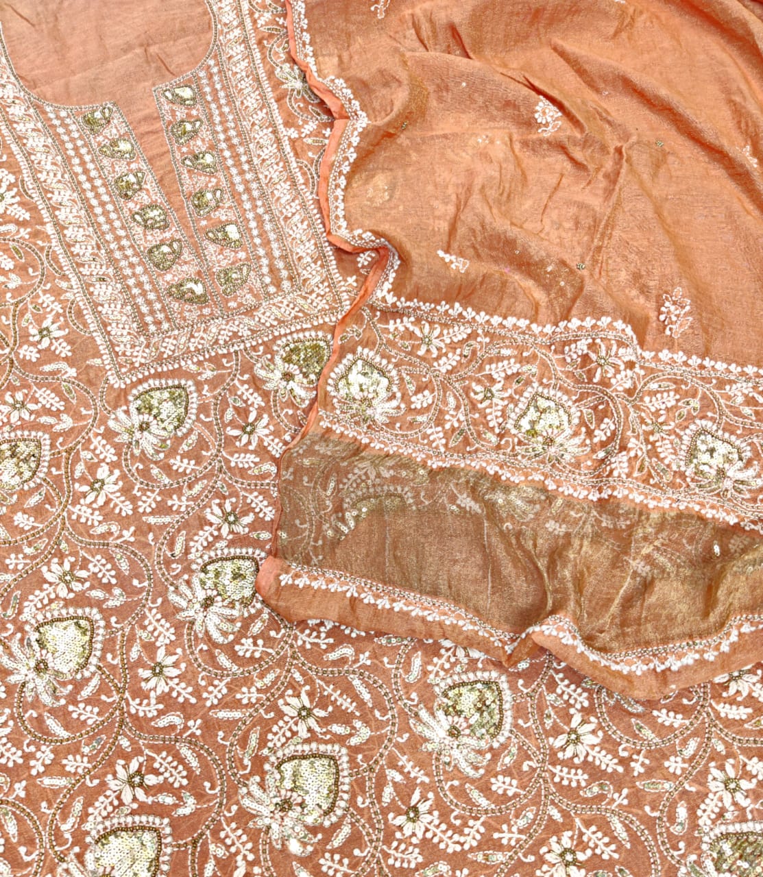 Beautiful Pure Tissue Chanderi Shirt & Dupatta having 3-taar Chikankari handwork embroidery work Embellished with Use small size of golden materials like pearl, sequins, cut-dana,Dabka, Mirror etc.