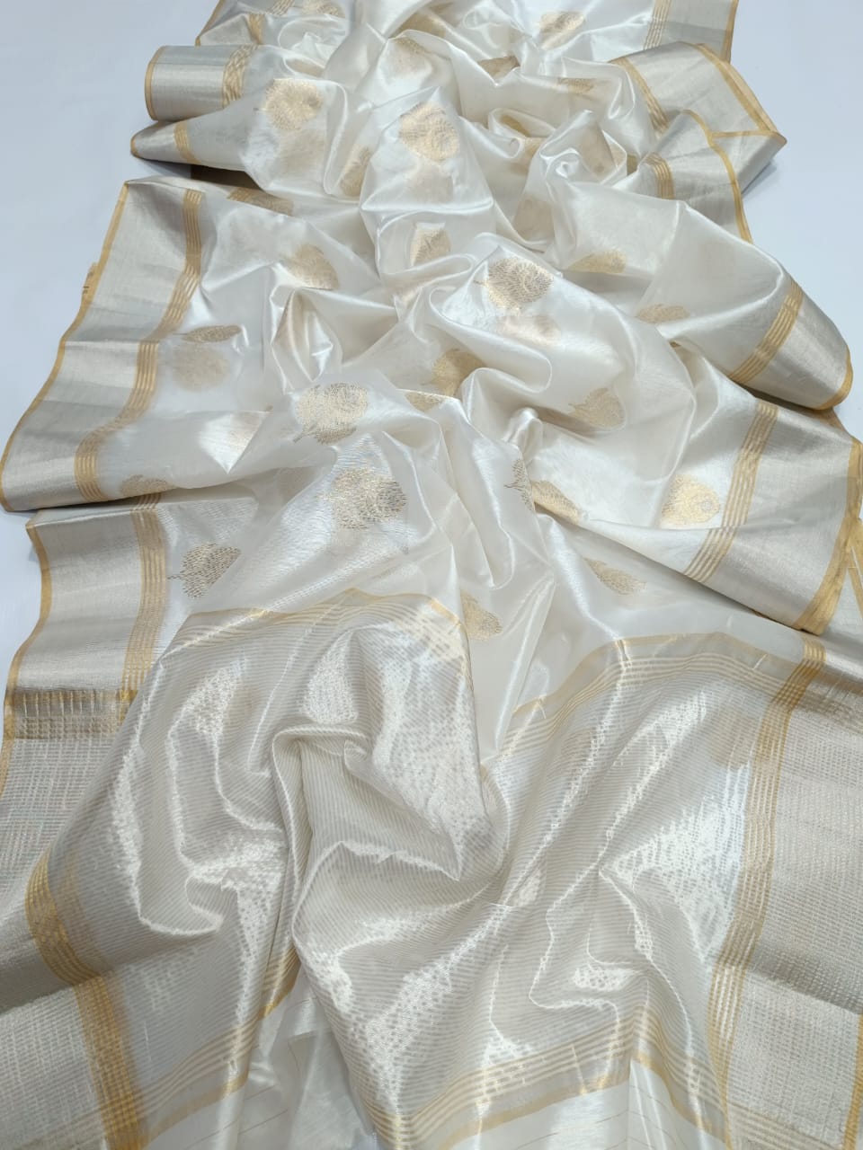 All-over silver Zari silver golden Zari buta with silver golden Zari designer solid border & silver golden Zari stripe zari pallu