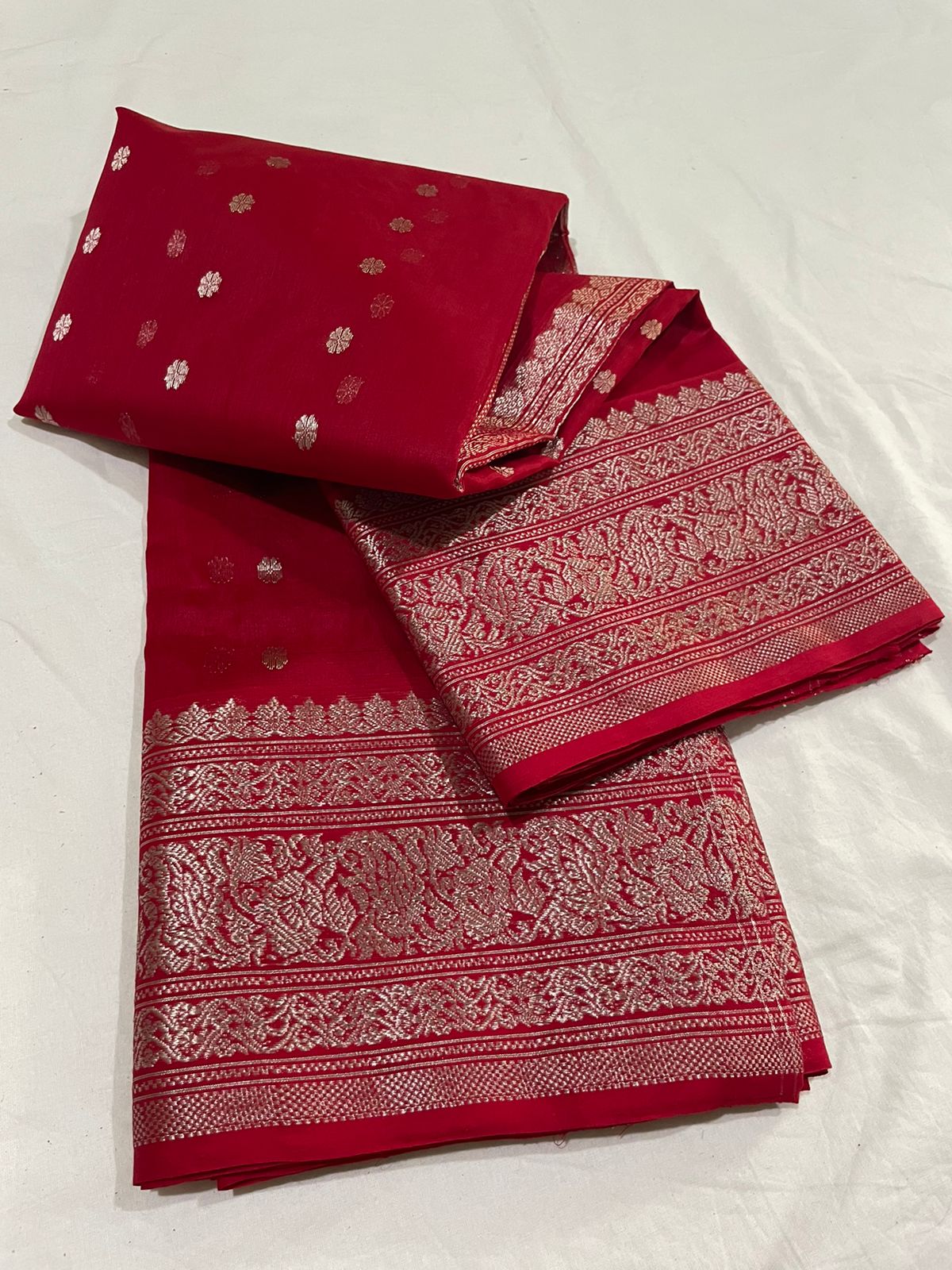 Dwell into this piece of excellence with beautifull motifs of silver zari weaved through finest