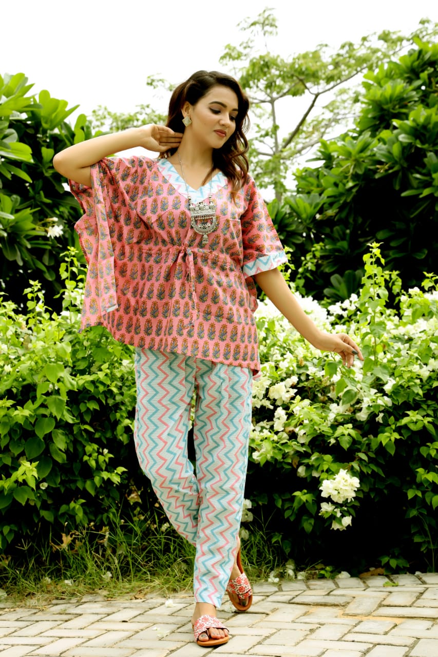 HomeAll Categories Traditional Bagru Handblock Printed Kaftan with pant set and with pockets